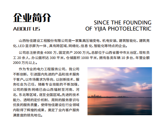 山西怡佳建設(shè)工程股份有限公司是一家集高壓輸變電、機電安裝、建筑智能化、建筑亮化、LED 顯示屏為一體,具有跨區(qū)域、網(wǎng)絡(luò)化、信息化、智能化等特點的企業(yè)。